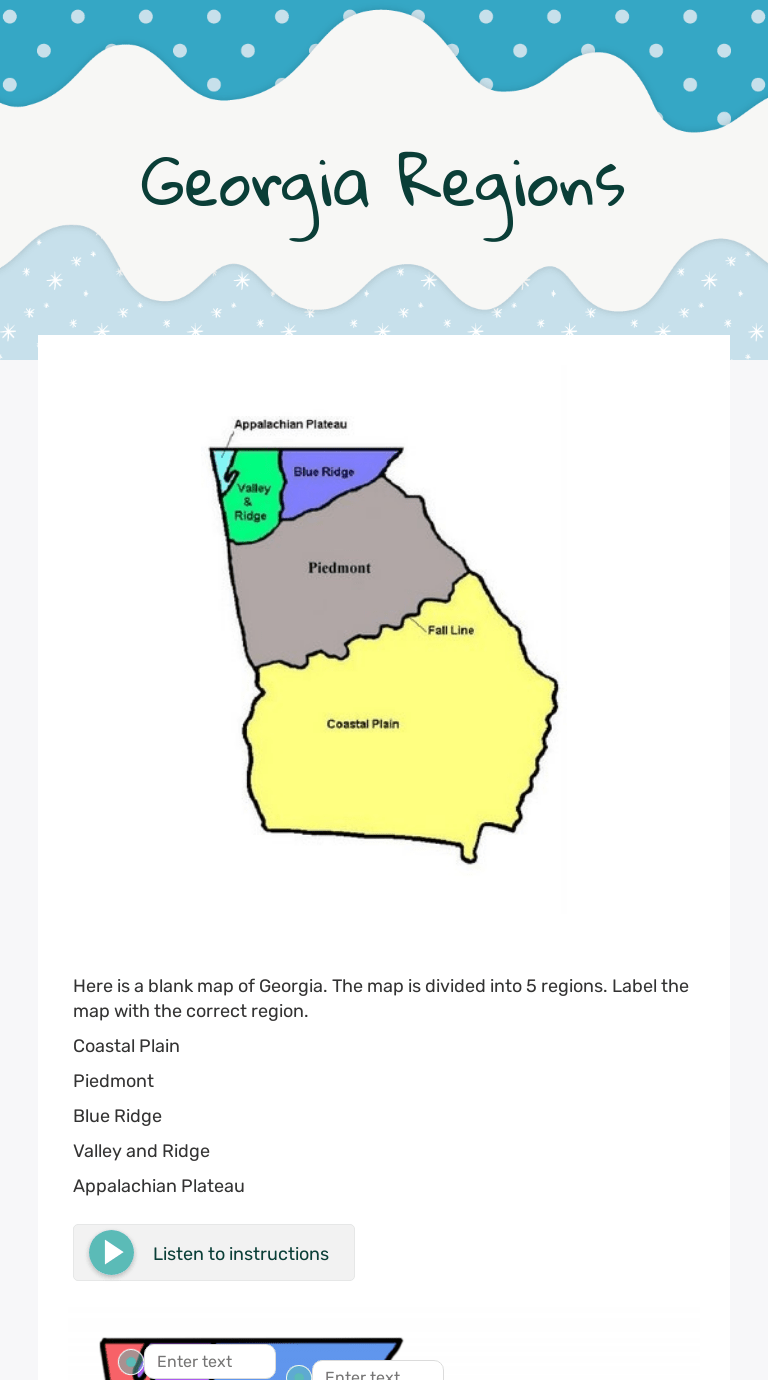 Label the 5 regions of georgia: Distinguish among the five geographic regions of georgia in terms of location,. Ga physical regions label the 5 physical regions in the state of georgia. Locate all the geographic regions of georgia: Georgia is divided into five different geographic regions: The students will complete this handout at the end of the lesson. Learn about the blue ridge mountain region of georgia, including how it was formed, its climate, wildlife, location, and industry. Textile and carpet industries in ga are based in this region. O georgia is made up of five geographic regions. Where plants and animals live · the resources above correspond to the standards listed below: Browse georgia regions resources on teachers pay teachers, a marketplace trusted by millions of teachers for original educational . From north carolina piedmont region worksheets to piedmont region indians videos, quickly find . Blue ridge mountain, piedmont, coastal.